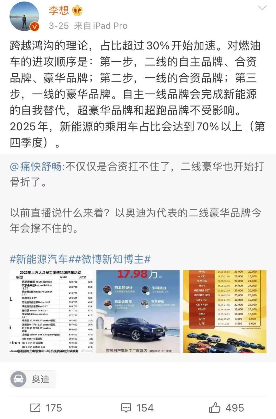 李想在今年2月业绩会上表示,理想汽车2023年将在30~50万价格区间的豪华SUV市场上拿下20%的市场份额。他对未来新能源市场份额的预测,占比将会达到70%以上。