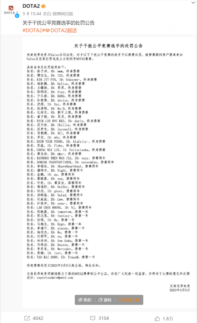 3月初,完美世界电竞和Valve宣布《DOTA2》46位选手禁赛的消息,如此大规模的禁赛消息,在国内电竞史上实不多见,尤其是其中还涉及了EHOME、Knights等队伍。