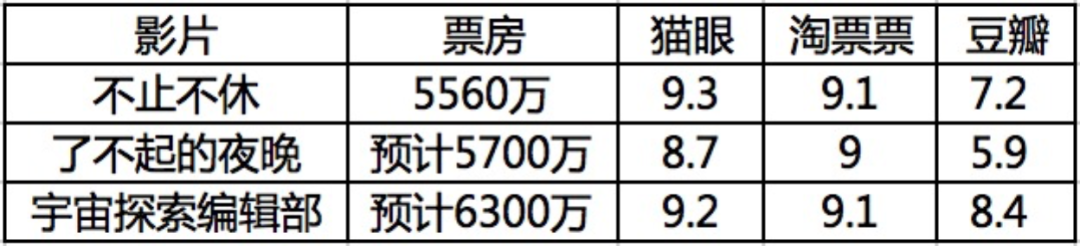 最终,《不止不休》、《了不起的夜晚》、《宇宙探索编辑部》三部行业里评价颇高的项目,像是商量好的一样,票房都清一色停留在了五六千万的体量,如果说区区这个票房体量就让它们达到了神片的标准,那只能说大家对神片的理解多少有些误会了。