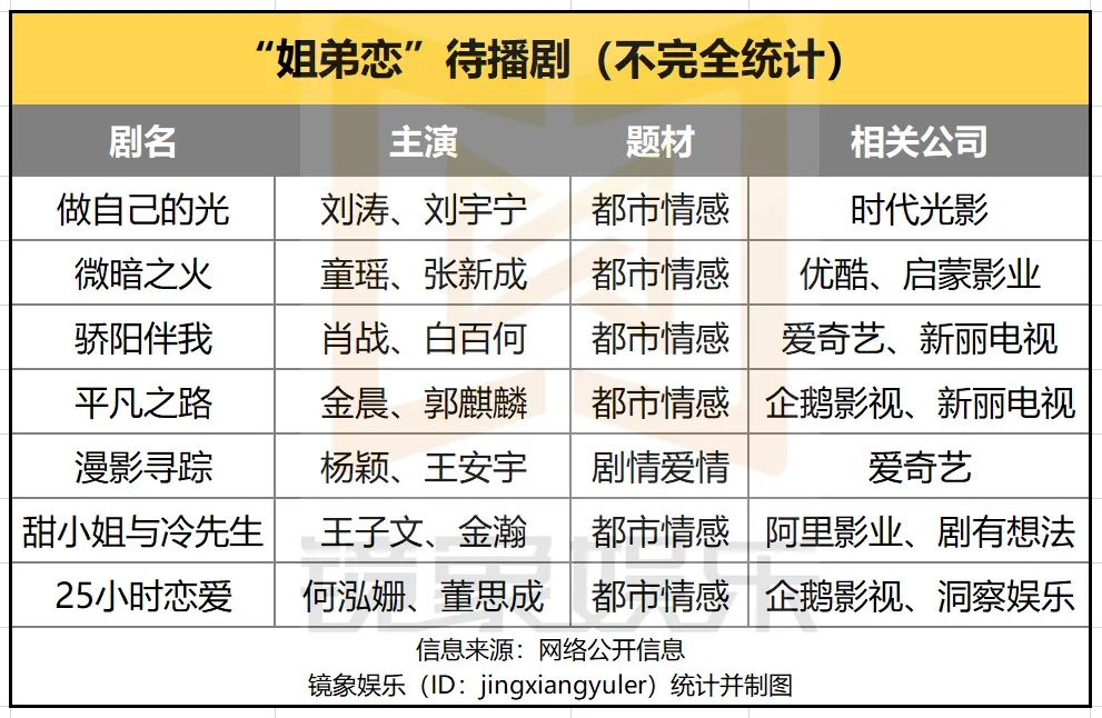 事实上,近两年关于“姐弟恋”的剧集如雨后春笋,早一些的《下一站是幸福》,后来的《炽道》《去有风的地方》等都是此类内容。而在待播剧中,《做自己的光》《微暗之火》《骄阳伴我》等进入排播周期,相关的内容布局还在继续,不知不觉中,“姐弟恋”已然成了剧集市场新的流量密码。