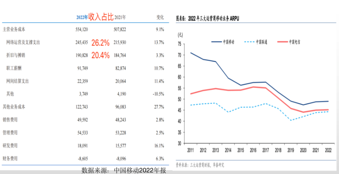 一方面,在“提速降费”的要求下,三大运营商降低了收入,提高了成本——我们会看到高比例的“网络运营及支撑支持”、固定资产折旧与摊销侵蚀了巨头们的利润,同时三大运营商的ARPU值(单月单用户产生的收入)总体下降。