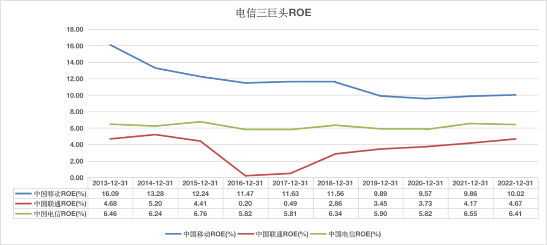 如下图所示,即便是最高的中国移动,2022年ROE也才刚刚超过10%,而电信和联通则分别只有6.42%和4.67%。联通在2016年、2017年ROE甚至一度不到1%。