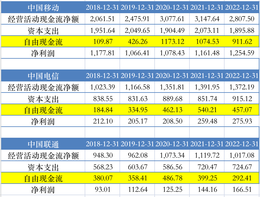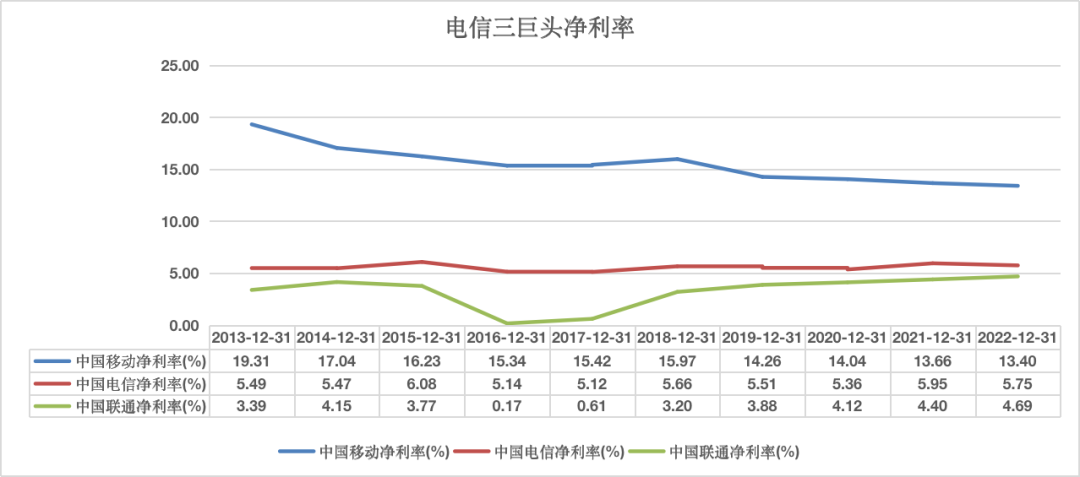 首先,电信三巨头的净利润率总体不算高。除了中国移动2022年尚能达到13.4%,中国电信和中国联通则2022年则分别只有5.75%、4.69%。