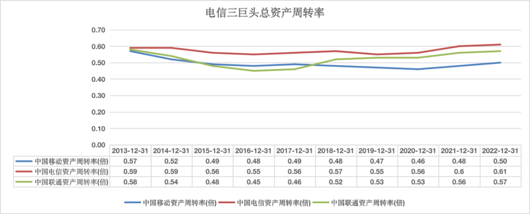 从总资产周转率来看,最近10年电信三巨头的这一指标形成了“两头高、中间低”的U字形,反映出三家公司资产营运能力逐步降低,后逐步回升,没有太大的变化。