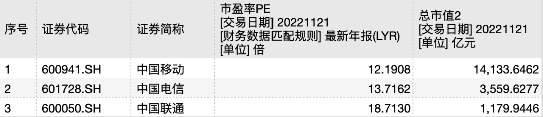 假设我们以“中特估”概念提出的前一天2022年11月21日作为观察点,三家公司在A股的市盈率分别为12.2倍、13.7倍、18.7倍。