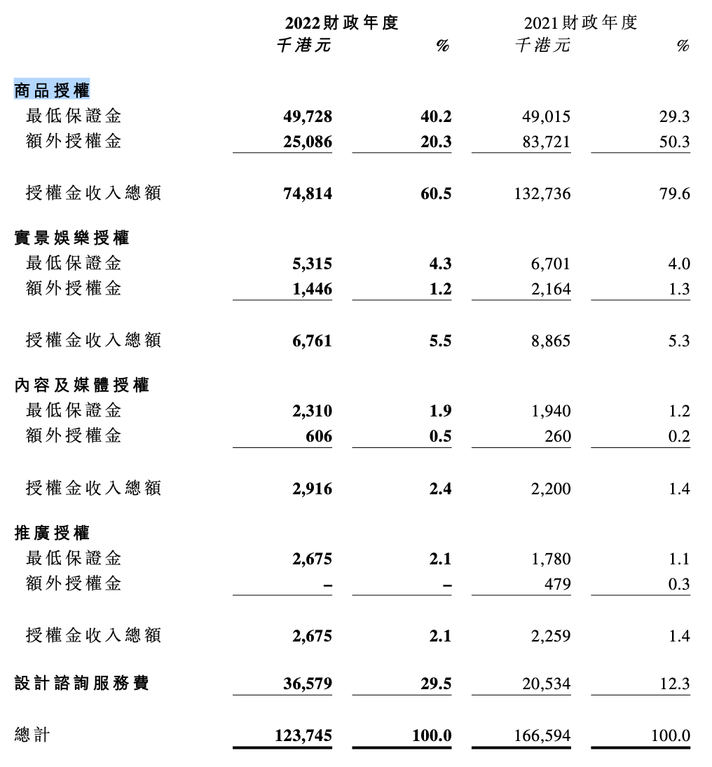 另外,从“收入构成”来看,IP授权业务带来的营收依旧占据大头,去年贡献约1.2亿港元,电子商务及其他业务收入近7000万。