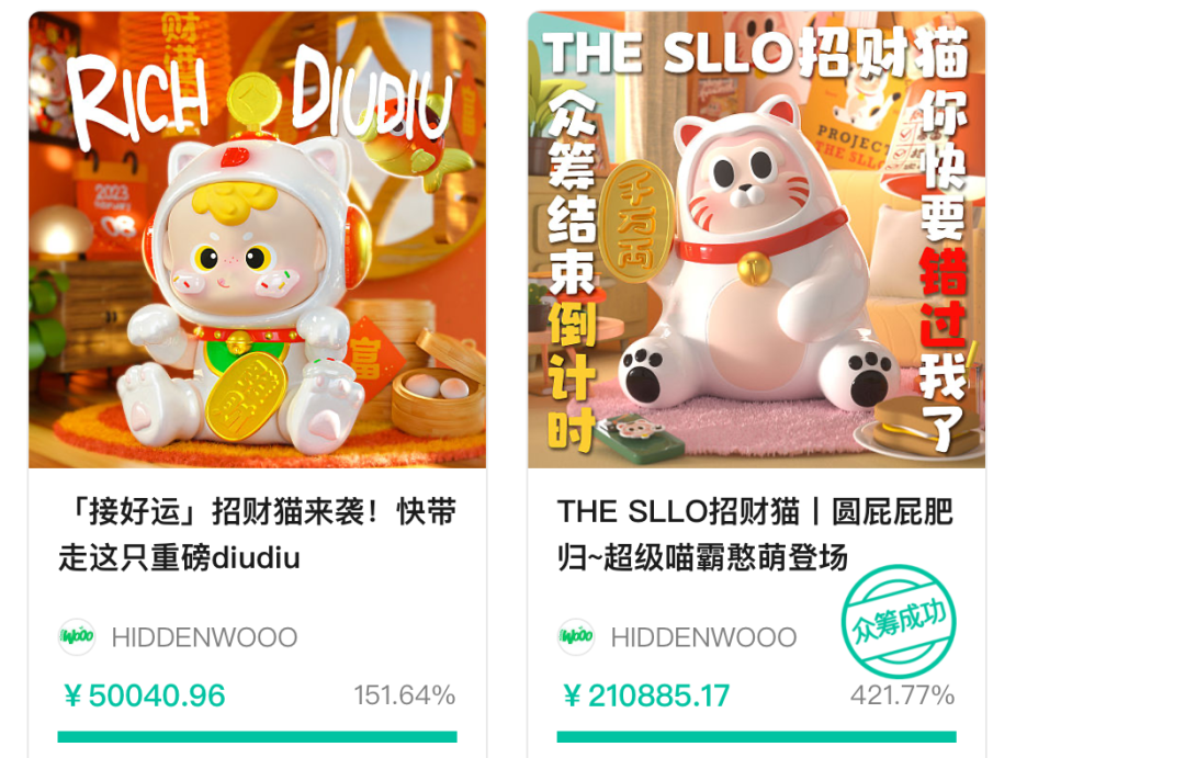 另外,该品牌(HIDDEN WOOO)也开设了官方天猫旗舰店,目前粉丝数量超过2万,店内销售10多款产品,有手机壳、毛绒玩偶、艺术版画等各类型周边;而在众筹平台摩点,显示该品牌目前为止发起了两个众筹项目,其中THE SLLO招财猫目标金额5万,最终筹得超21万,完成度为421.77%;另外一款diudiu系列产品已筹超5万元,目标金额为3.3万。
