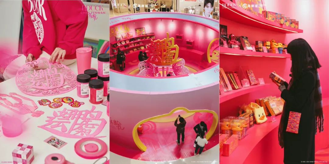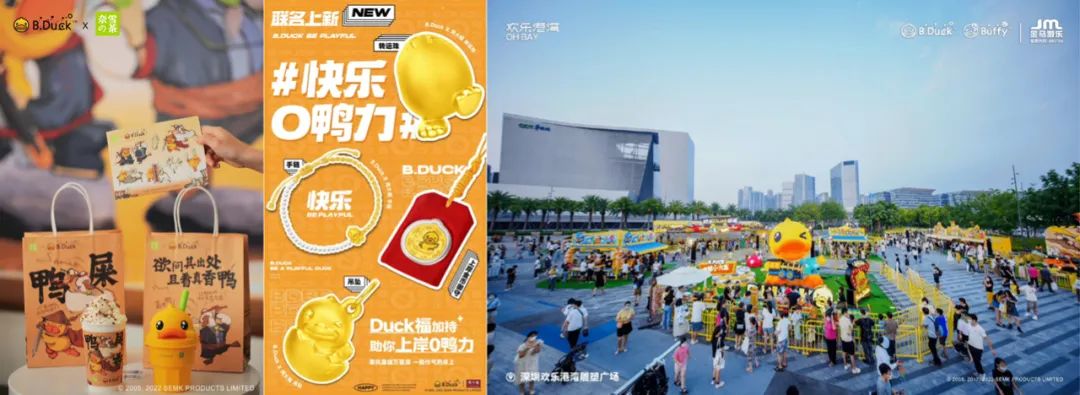这里有个非常典型的例子是今年年初,B.Duck与“90后顶级剪纸艺术家”陈粉丸打造联名项目“好运鸭先知”。一方面陈粉丸大胆、强烈的剪纸特色与小黄鸭经典形象发生碰撞,另一方面B.Duck还携手“周大福”、“十八纸”等6个授权商开发30+衍生产品,涵盖“家居”、“潮玩”、“户外”等领域,更于深圳海岸城举办线下快闪,“福禄Duck园林”、“好运转不亭”两大主题板块构成极具东方美学特征的庭院式结构。据了解该活动在社交媒体平台的曝光量超过了1600万。