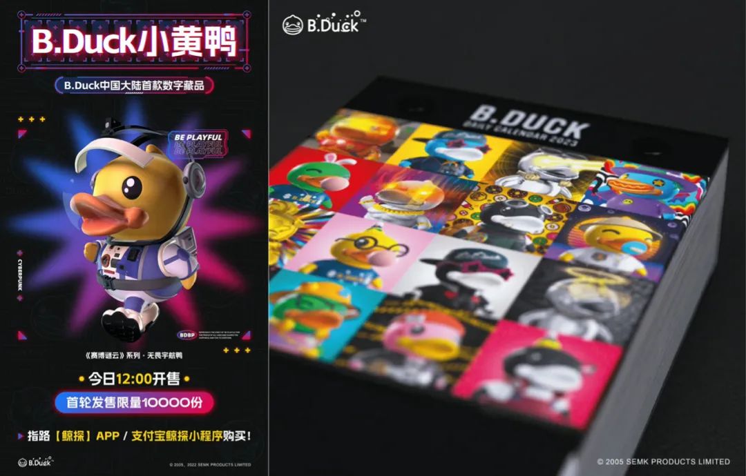 小黄鸭曾于2021年年底宣布推出首个NFT B.Duck小黄鸭系列,并于去年上半年合共推出三轮NFT系列。去年11月,其在鲸探发售了B.Duck小黄鸭中国大陆首款数字藏品“赛博谜云”系列,还推出NFT风格插画的2023年创意台历。可以说是动作频频,积极尝试与开拓。