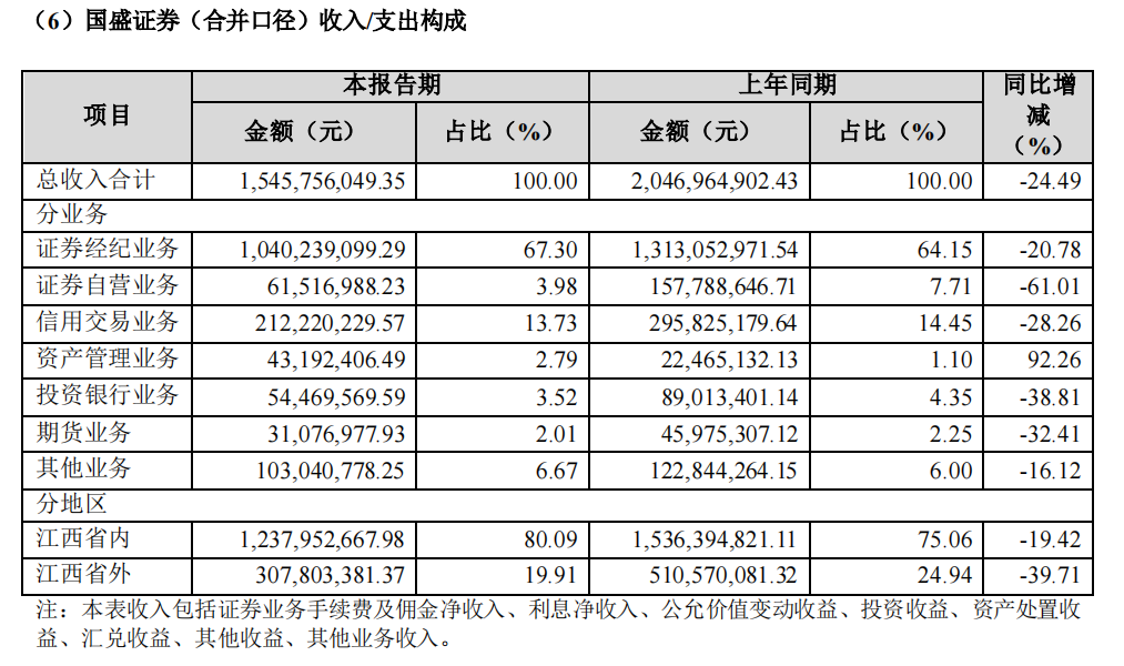 报告期,国盛证券(单体)实现营业收入18.55亿元,营业利润1亿元,净利润0.9亿元,营业收入较上年同期减少18.01%、营业利润和净利润分别较上年同期减少81.07%、76.84%,主要由于经纪业务收入减少、本期信用减值损失增加及投资收益减少所致。