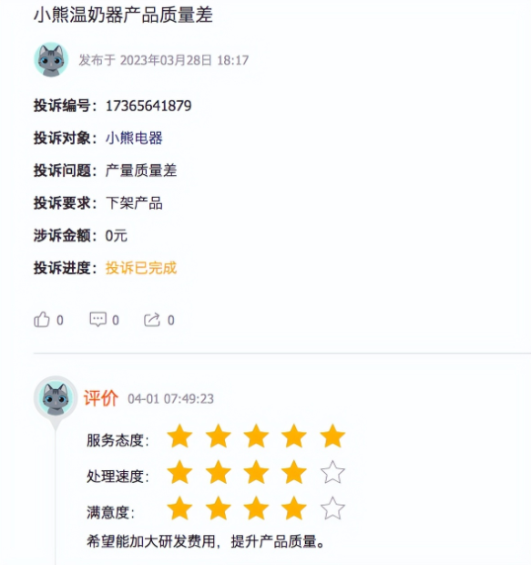 这起投诉在4月1日被用户确认完成,小熊电器透露已经为该网友特殊申请了免运费返厂免费维修,客户知悉并同意。而这位网友确认投诉完成时,给出的评价是服务态度5颗星,处理速度和满意度为4颗星,并留言称“希望能加大研发费用,提升产品质量”