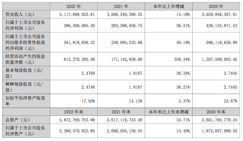其中营收为41.18亿元,上年同期为36.06亿元,同比增长14.18%。归属于上市公司股东的净利润为3.863亿元,上年同期为2.834亿元,同比增长36.31%;归属于上市公司股东的扣除非经常性损益的净利润为3.618亿元,上年同期为2.581亿元,同比增长40.19%。
