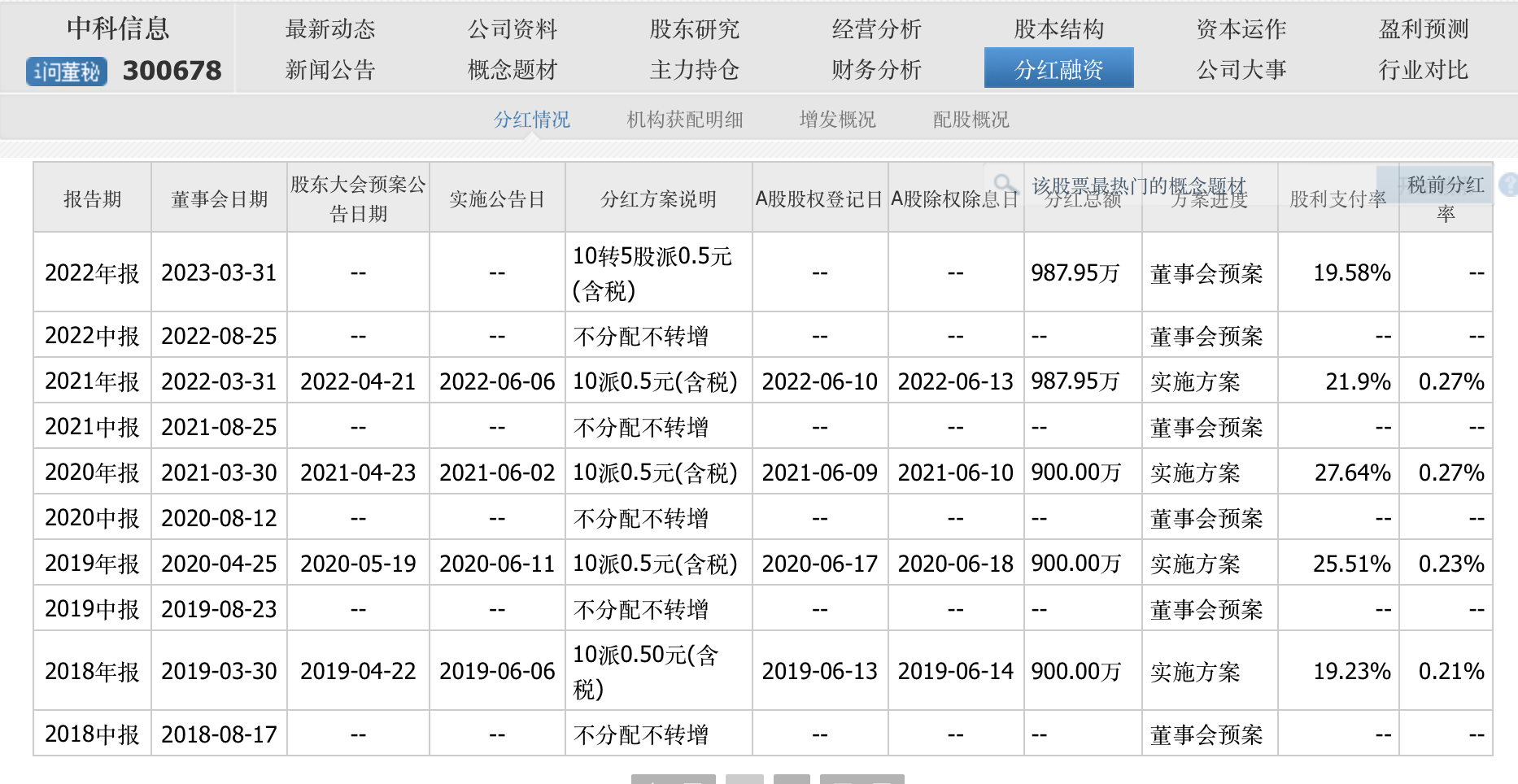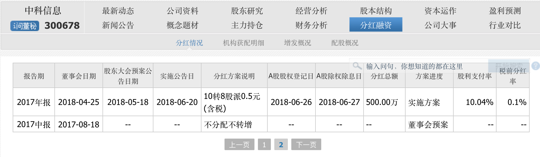 需要指出的是,这次中科信息还打算以1.98亿股为基数,向全体股东每10股派发现金红利0.5元(含税),送红股0股(含税),以资本公积金向全体股东每10股转增5股。从历史来看,中科信息进行高送转,还是比较稀奇的。该公司是2017年7月28日上市,也就是2017年年报搞了一次10转8派0.5元。所以难得的高送转,也令公司收到了来自监管层的关注函。