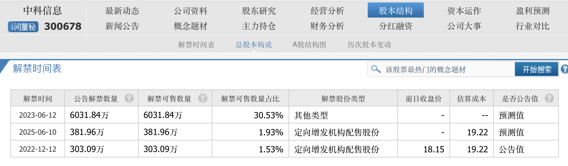 界面新闻注意到,就在不久后的2023年6月12日,中科信息将迎来6031.84万股的解禁,占到了总股本的30.53%。