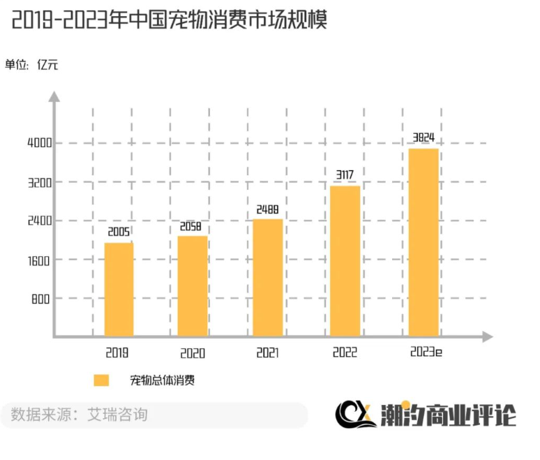 宠物相关商品和服务需求越发多样,国内宠物消费市场规模快速增长,据艾瑞咨询数据显示,2022年市场规模约为3117亿元,预计2023年市场规模约为3924亿元,2019年-2023年复合增长率可达33%。