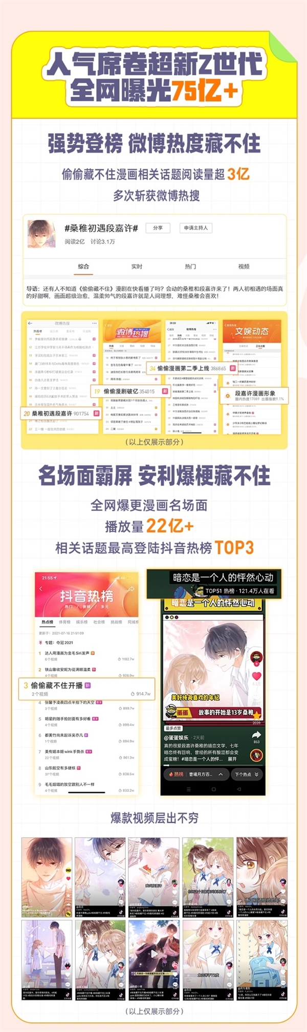 作为2022年全网最受关注的人气少女国漫,《偷偷藏不住》人气席卷超新Z世代,全网曝光量突破了75亿,目前在微博上相关话题阅读量超3亿,#桑稚初遇段嘉许#、#偷偷漫剧破亿#、#偷偷漫剧第二季上线#、#段嘉许漫画形象#等话题多次斩获微博热搜。同时,全网短视频博主亦纷纷爆更漫画名场面,视频播放量超过22亿,相关话题最高登陆抖音热榜TOP3,爆款视频更是层出不穷、持续霸屏。