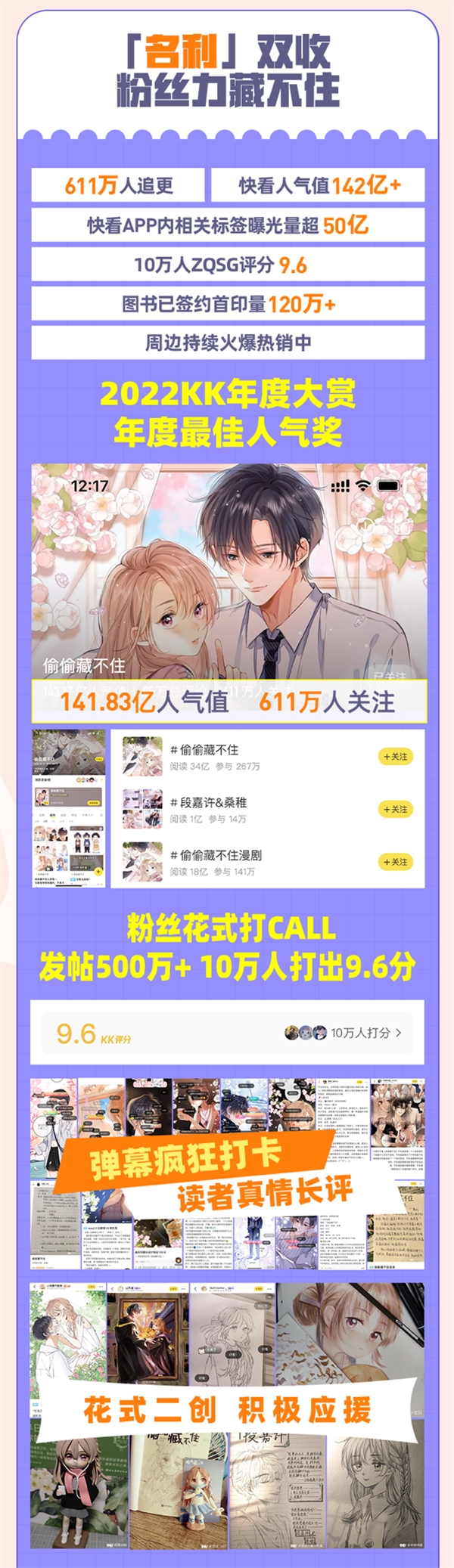 而在快看APP内,《偷偷藏不住》吸引了611万人追更、人气值142亿+,相关标签曝光量超50亿。通过弹幕、打卡、晒图、真情长评、二创应援等多种方式,众多粉丝花式为漫画打CALL,发帖超过500万,10万人打出9.6的评分。