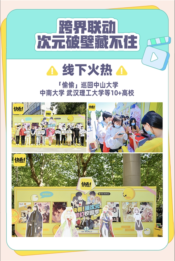 《偷偷藏不住》的线上火热,也直接跨界联动延续到线下。在中山大学、中南大学、武汉理工大学等10余所高校的巡回之旅中,《偷偷藏不住》中的漫画形象吸引了众多高校学子纷纷打卡围观,新华网、澎湃、光明网等主流媒体的报道,更是让漫画破次元出圈。