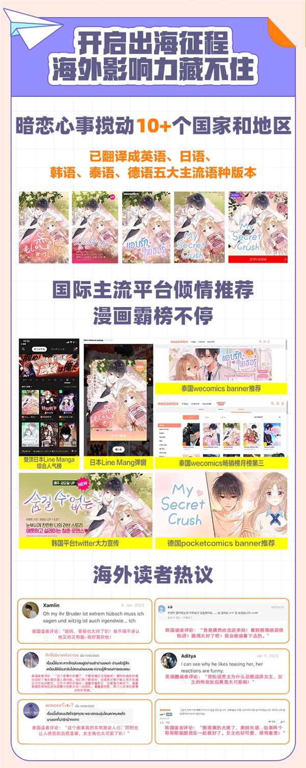除了国内人气爆棚,《偷偷藏不住》的出海征程亦有了不菲收获。此次战报显示,该漫画已已翻译成英语、日语、韩语、泰语、德语五大主流语种版本,登陆10余个国家和地区,并获得多个国际主流平台倾情推荐,霸榜不停。海外读者也是为男女主间的故事着迷感动,争相评论:“这个故事真的非常激动人心,同时也让人感觉到治愈温暖,女主角也太可爱了”、“画面真的太美了,美到失语”、“这个故事太好看了,看的时候我好像也回到了高中恋爱某人的时候”……