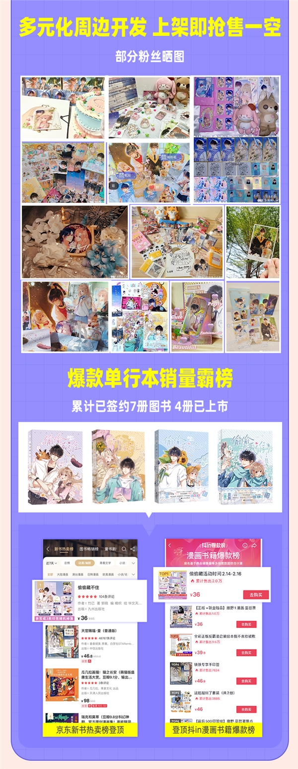 超高的人气热度,也让《偷偷藏不住》名利双收,不仅获得2022KK年度大赏的“年度最佳人气奖”,也带动周边的热销,目前累计开发周边20+次,爆款单行本销量霸榜,累计已签约7册图书,其中4册已上市,首印量120万+。