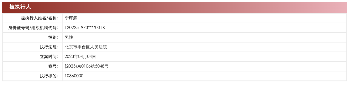 中国执行信息公开网显示,4月4日,婚戒品牌I Do母公司恒信玺利实业股份有限公司、李厚霖、李伟森新增一则被执行人信息,执行标的为1086万元,执行法院为北京市丰台区人民法院。