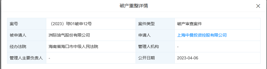 天眼查App显示,4月6日,洲际油气股份有限公司新增破产审查案件,申请人为上海中曼投资控股有限公司,经办法院为海南省海口市中级人民法院。洲际油气股份有限公司成立于1984年8月,于1996年10月A股上市,其法定代表人、董事长为陈焕龙,注册资本约22.64亿元,由广西正和实业集团有限公司、深圳市中民昇汇壹号投资企业(有限合伙)、湖南省恒畅投资有限公司等共同持股。风险信息显示,该公司存在多个被执行人信息,被执行总金额超5.8亿元,此外还存在失信被执行人、限制消费令、终本案件信息。