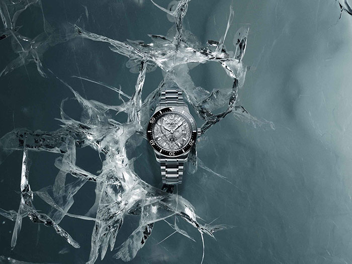这枚全新潜水时计以灰色调的冰川冰为灵感。为了展现冻结了数千年之久的冰川冰所形成的纹理和质感,万宝龙手工刷制“冰川纹”表盘,呈现出逼真的冰川深邃感和光泽度。表背特别镌刻立体图案,立于海面的冰山以及于水下探索的潜水员栩栩如生。