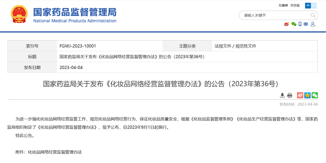 4月4日,国家药监局发布了《化妆品网络经营监督管理办法》(下称《办法》),自2023年9月1日起施行。