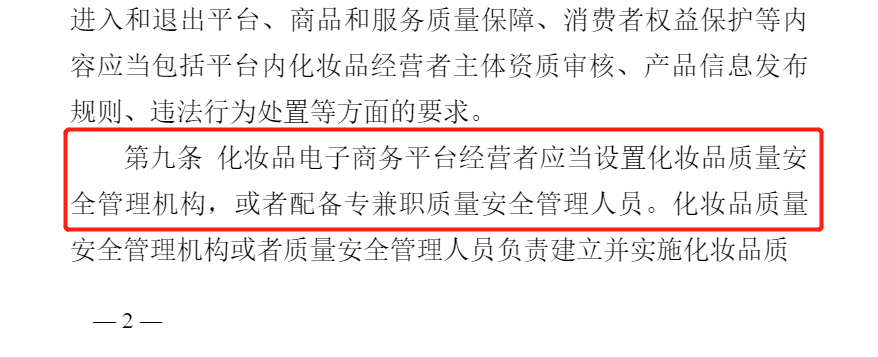 值得注意的是,《办法》第九条明确规定,化妆品电子商务平台经营者应当设置化妆品质量安全管理机构,或者配备专兼职质量安全管理人员。化妆品质量安全管理机构或者质量安全管理人员负责建立并实施化妆品质量安全管理制度,并组织开展平台内化妆品经营者的日常检查。