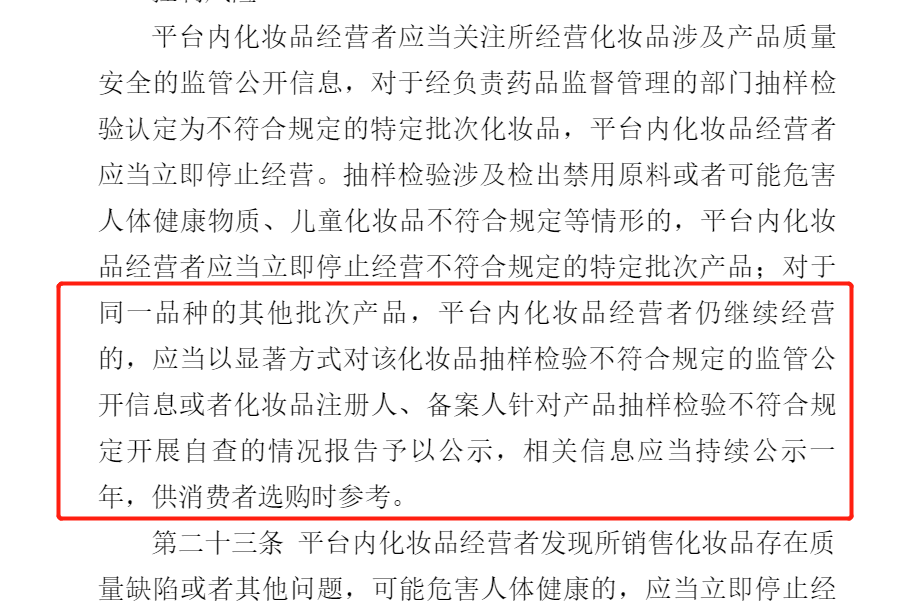 值得一提的是,除了明确产品信息之外,《办法》第二十二条还规定,如果商家所经营化妆品,在抽检中检出禁用原料或有害物质、儿童化妆品不合规的情形,商家应当立即停止经营不符合规定的特定批次产品。