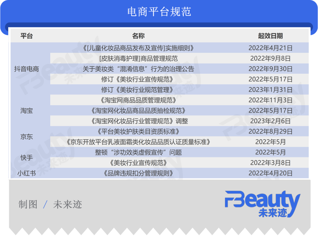 《FBeauty未来迹》整理发现,在过去一年里,主流电商平台淘宝、京东、抖音、快手以及小红书等,纷纷启动平台新政,主动走向更规范化的管理,出台或修改了一系列规范管理细则。