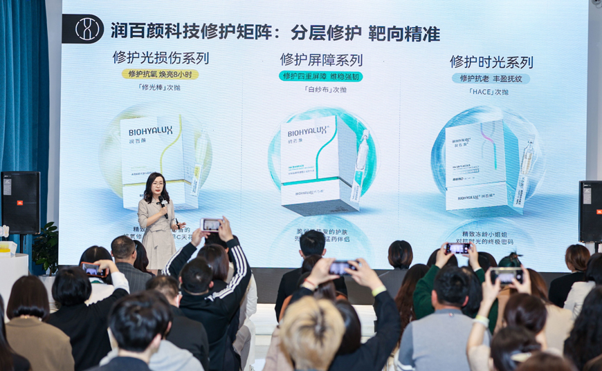 恰如凯度对于市场的精准洞察那样,润百颜在这场发布会上还首次公布了对“修护”市场的全新阐述,杨君指出,在对皮肤机理进行了深入洞悉之后,润百颜提出了“分层修护”的理论,即通过表层、中层、底层进行精准修护,并打造了三条修护产品路径:修护屏障损伤、修护光损伤、修护时光损伤。众所周知,传统的修护只是针对敏感肌的一种品类,而润百颜首次将修护的定义进行了精确的延展和扩充,可以说是修护赛道的一次颠覆性变革。