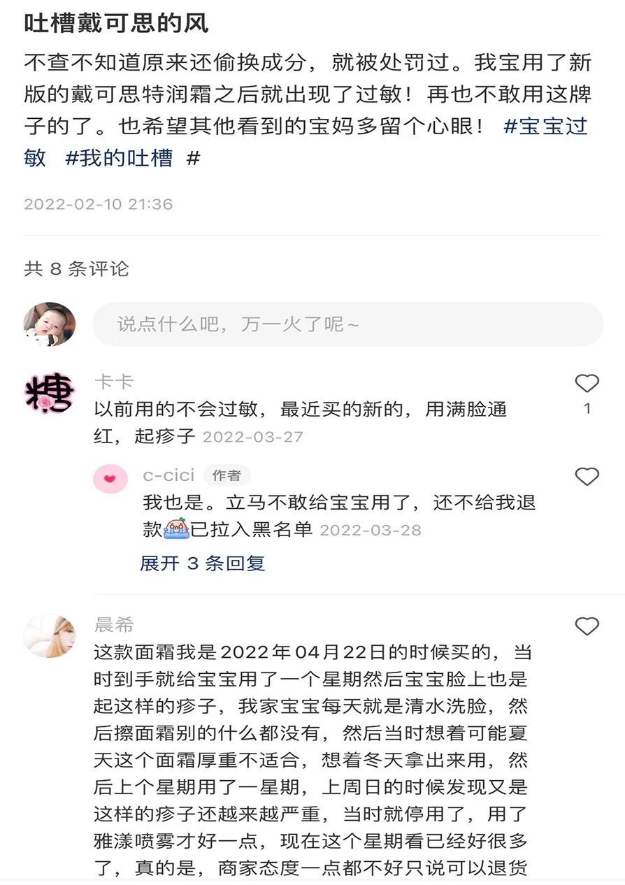 戴可思主打的婴儿金盏花护理面霜引发婴童过敏等不良反应的现象并非孤例,当产品主打“无添加”的卖点变成了业内的“产品标配”后,戴可思还有多少“赢面”?而其早期依靠KOC打响口碑的模式今后还能否走得通?