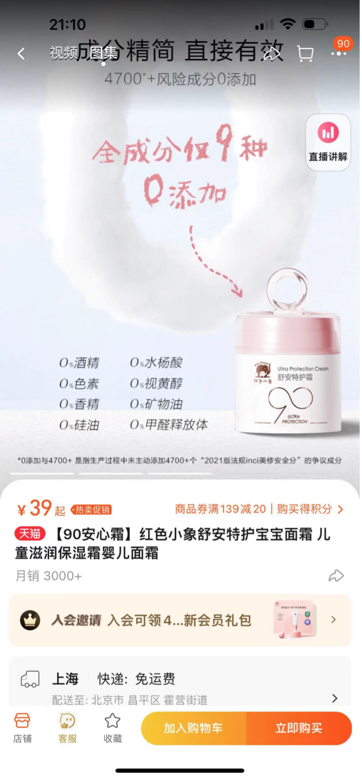 以红色小象舒安特护霜为例,在其旗舰店产品首页,成分表中就明确注明了8项“0添加”字样。