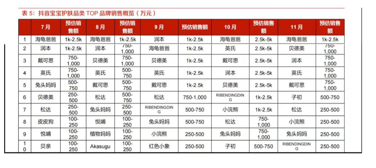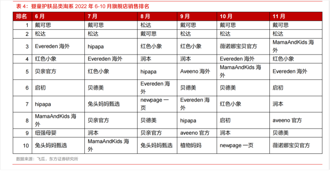 根据东方证券研究所数据,在婴童护肤品类淘系2022年6-10月旗舰店销售排名中,戴可思尚在前一二名浮动;而在抖音宝宝护肤品类TOP品牌销售榜单中,从去年7-11月,戴可思排名则普遍在三名及之后,不及海龟爸爸、润本、松达等品牌。