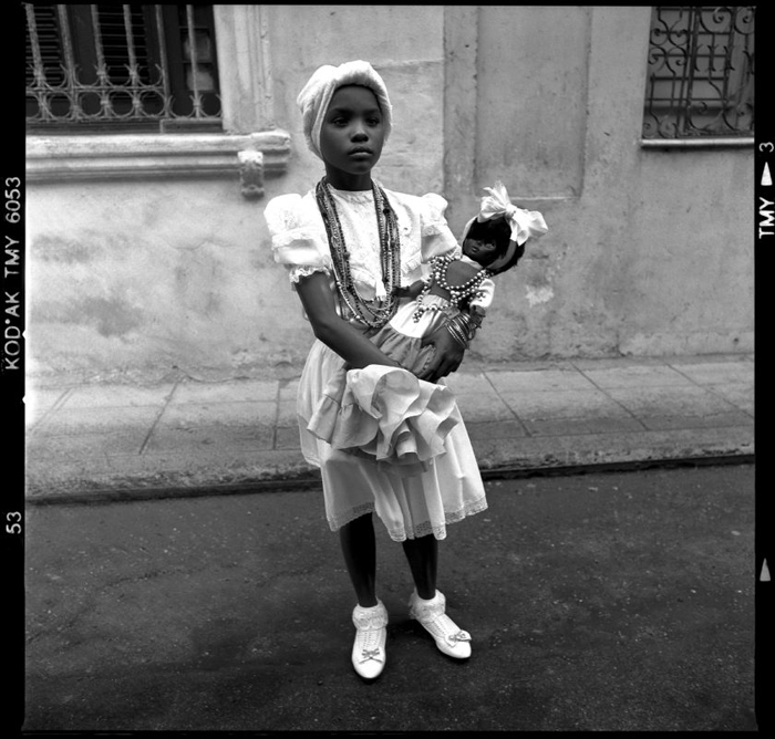其中一张照片拍摄的是一个穿着白色连衣裙的小女孩。身形矮小的她,怀里抱着一个有着类似打扮的娃娃,脸上的表情严肃而冷静。她刚刚经历了隆重的萨泰里阿教(古巴宗教)的入教典礼。