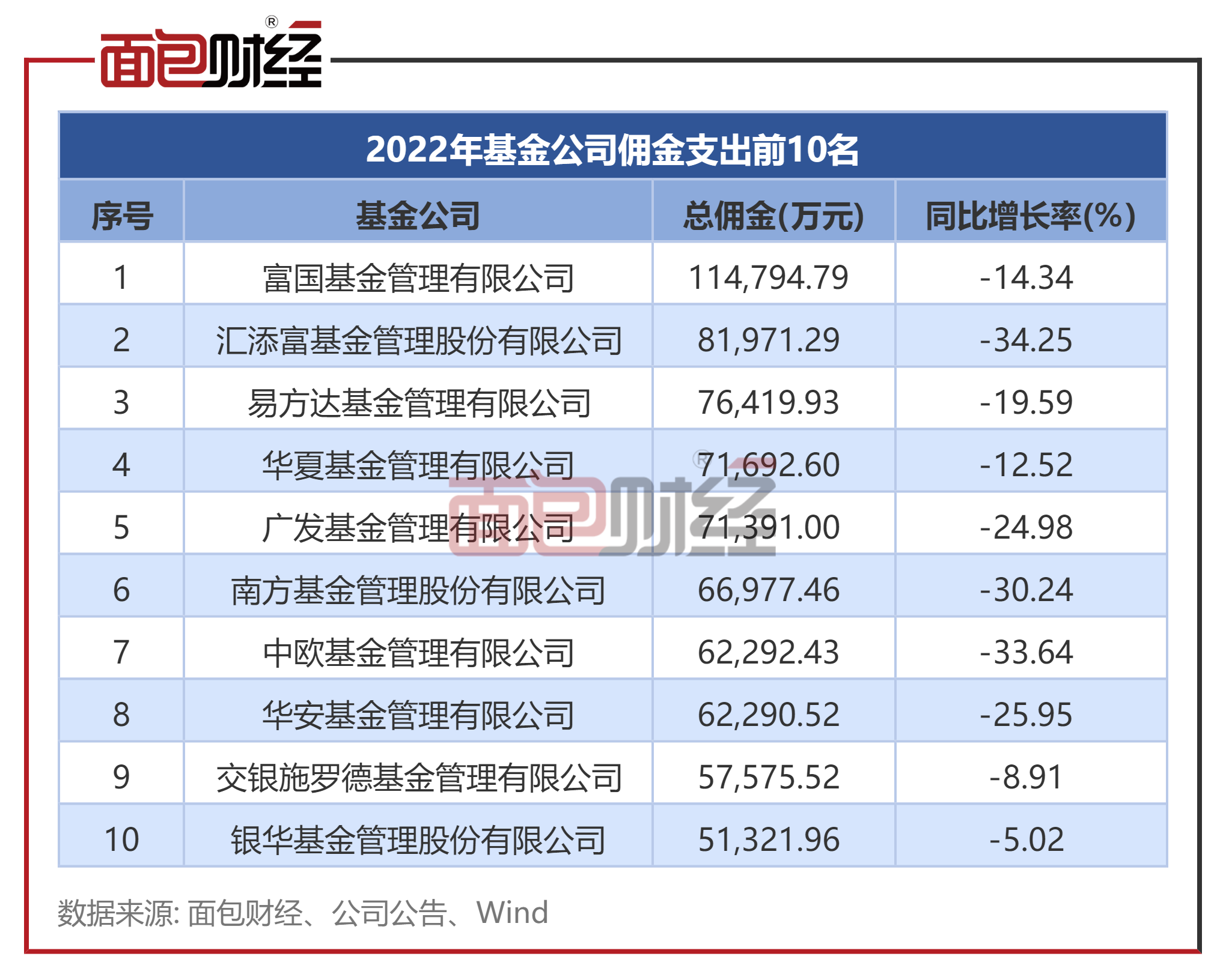 按照基金公司统计,由于管理规模较大,富国基金、汇添富基金、易方达基金2022年佣金支出排名前三。
