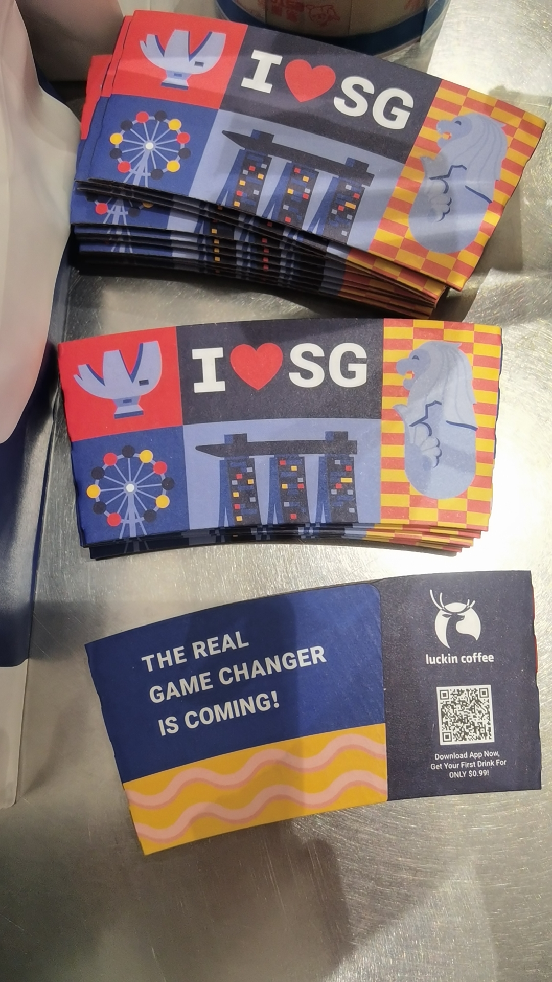 正式开业当天,瑞幸也推出优惠策略:新用户下载瑞幸APP并注册可以用0.99新币(1新币约合5.17元人民币)的价格购买第一杯饮品;并且附赠一张5折券。瑞幸也专门定制了新加坡专属杯套,上面写着“The real game changer is coming!”展现出瑞幸要在新加坡重塑咖啡市场格局的决心。