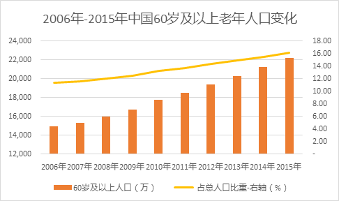 老年人口还在不断增长,未来还有加速趋势。统计数据显示,自”十一五”规划以来,十年内,中国60岁及以上老年人口增加了7299万人,增加比例48.98%,年平均增速为4.90%。从2006年开始,60岁及以上人口占总人口比重逐年上升,至2010年增速达到顶峰,2011年有所减缓,2012到2015年依旧保持年平均4.65%的高连续增长。