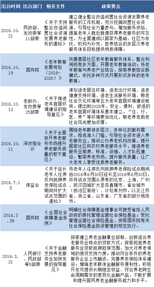 2016年,中国政府出台了7个以上的有关养老领域的政策,涵盖金融、房地产、服务业等诸多领域,扶持养老服务业,以应对人口老龄化。养老服务作为重要的议题,在10月11日召开的中央全面深改领导小组会议第二十八次会议上,会议通过了全面放开养老服务市场的意见,要求引导社会资本进入养老服务业。