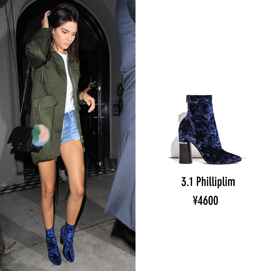 丝绒今年真是超级流行,比起大面积的服饰类,来双丝绒短靴应该是大多数人都可以接受的,毕竟它面积小而且chic。今年时装周时就有双丝绒靴特别火,深蓝色的,比较好搭,来自3.1 Phillip Lim,肯豆用它搭牛仔短裤和军绿色大衣。
