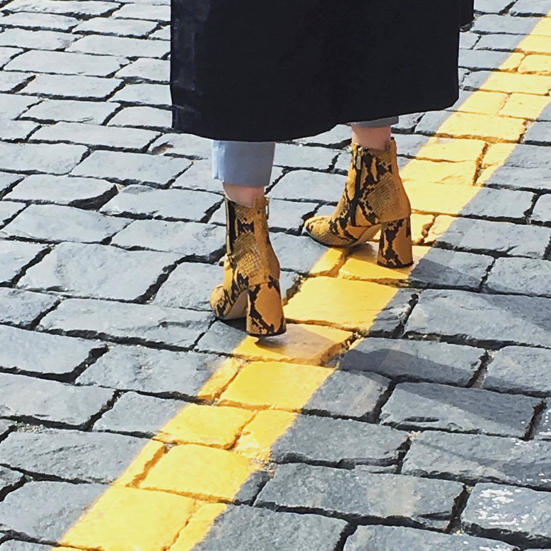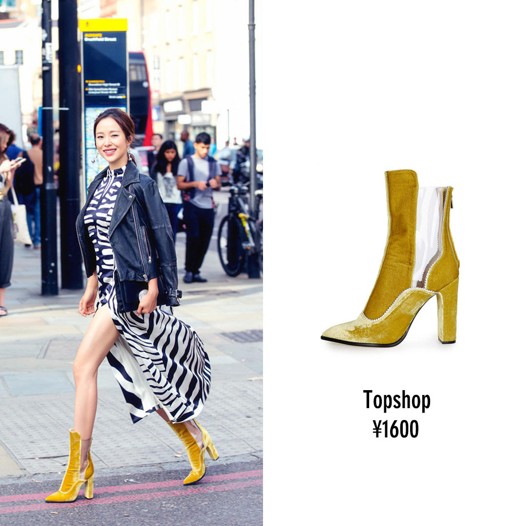 还有Topshop,江一燕之前的一组街拍穿了一双黄色的丝绒短靴,好亮眼。