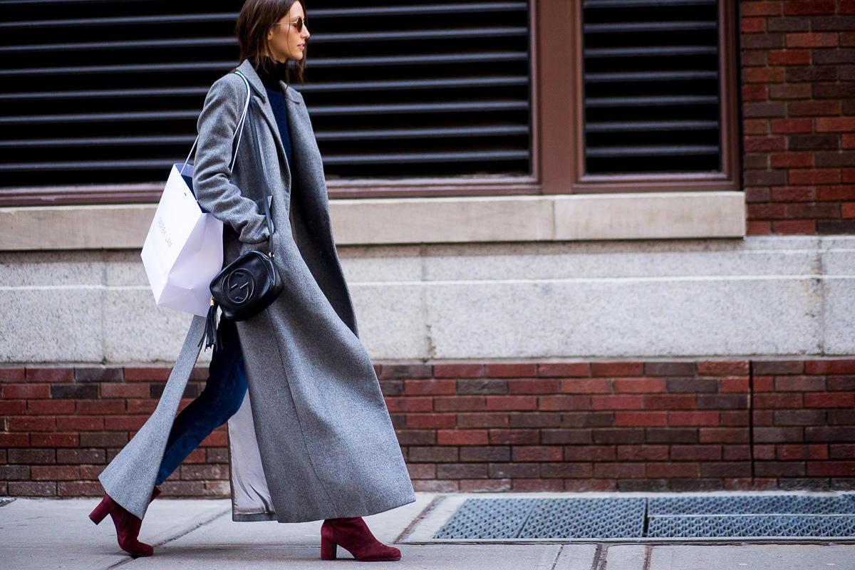 如果你还是没有勇气尝试丝绒这种特别时髦的单品,你可以有一双麂皮包腿小粗跟。一双有品位的酒红色,配上超长大衣,保暖和时髦兼具。