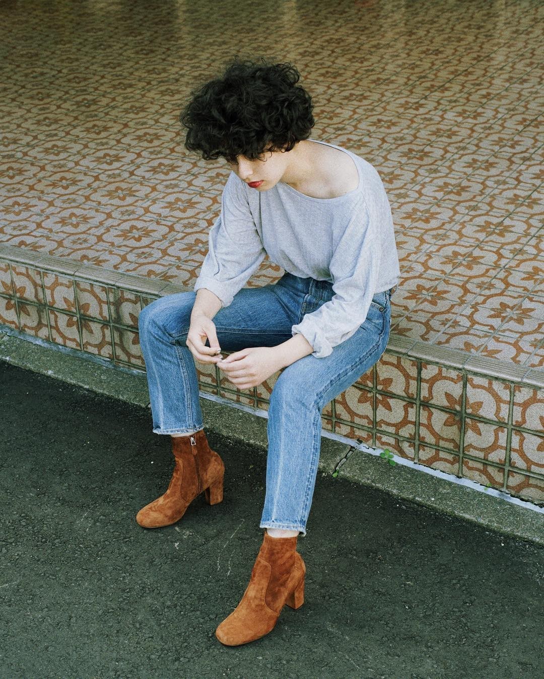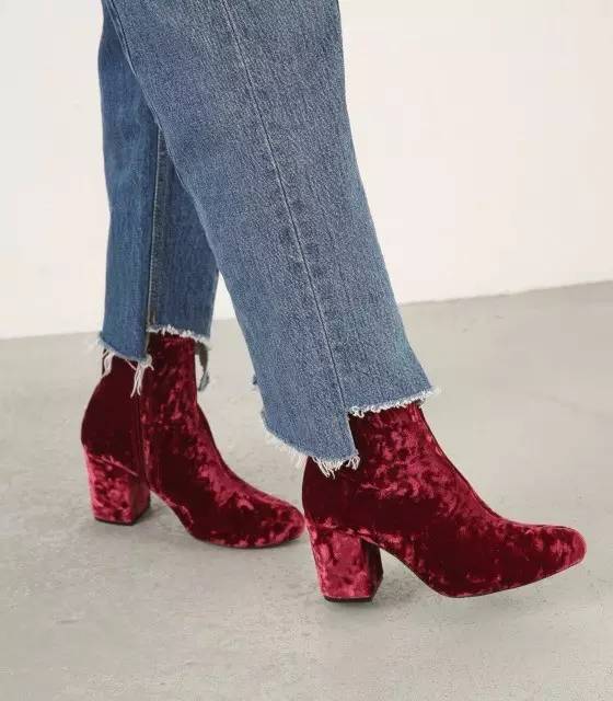 Moussy今年主推的靴子就是这一双丝绒短靴,价格在1000元左右,也很好看,模特图中这样子配剪破的牛仔裤是今年秋冬最时髦的穿法,而且还不会冷。