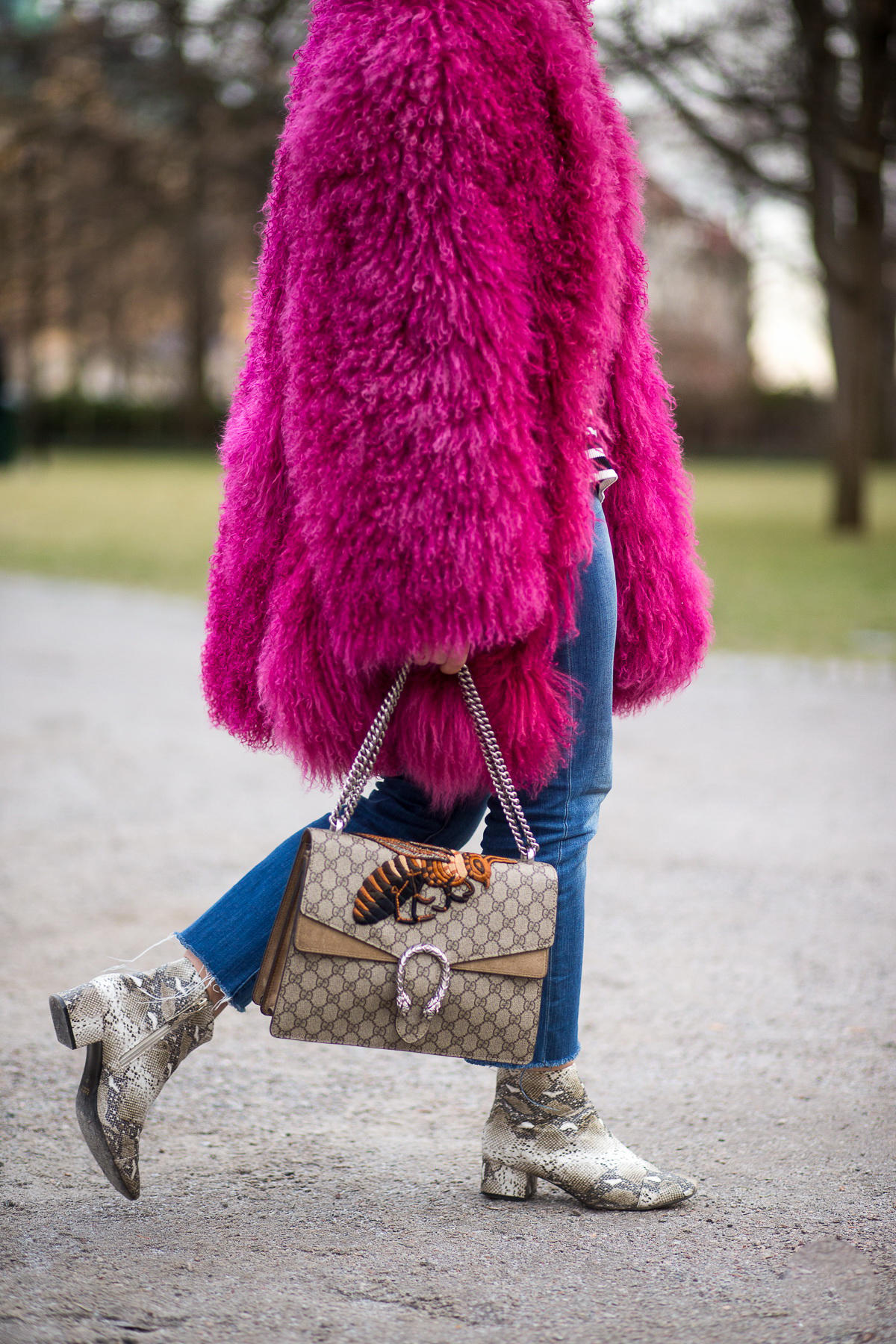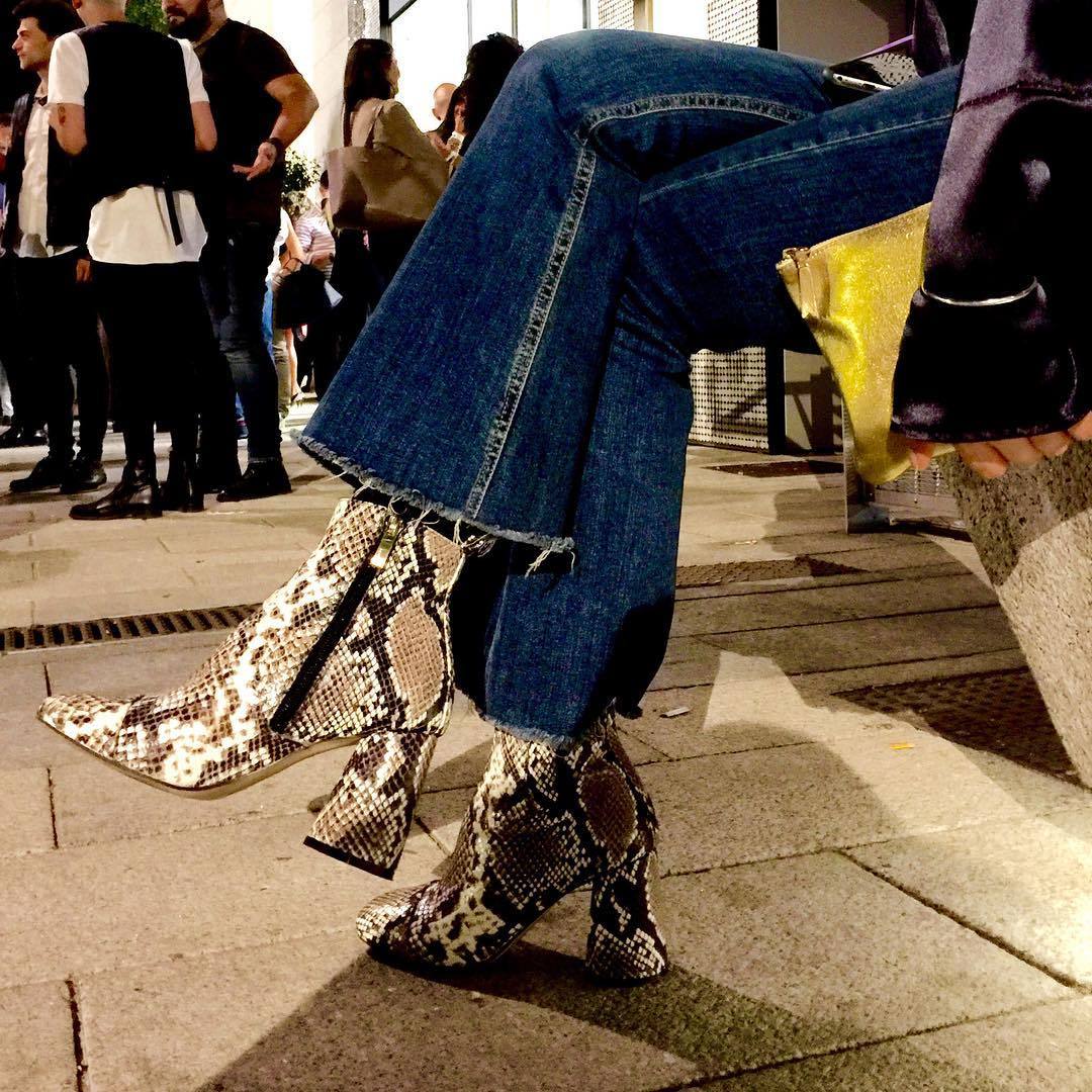 还有一个今年的流行单品就是蛇纹皮的短靴,不过预感受众面窄,毕竟不是谁都能hold住。一定要时尚时尚非常时尚的人士才能驾驭蛇纹配皮草吧。