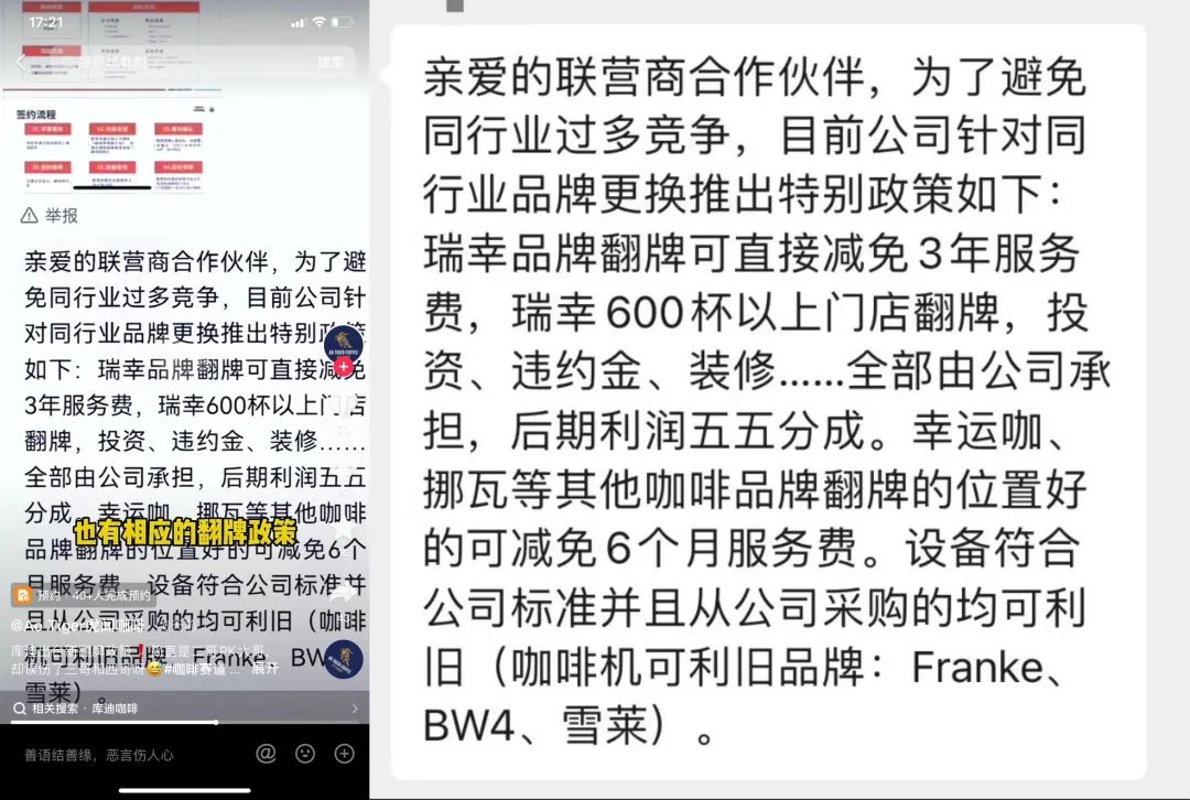有业内人士分析称,库迪此举或是看中了一些合同到期的瑞幸咖啡加盟商,瑞幸早在2019年就以子品牌小鹿茶试水“新零售合伙人模式”,到了2021年1月,瑞幸官方正式发布新零售合作伙伴计划,开放瑞幸咖啡的加盟渠道,并打出了“0加盟费”的旗号。