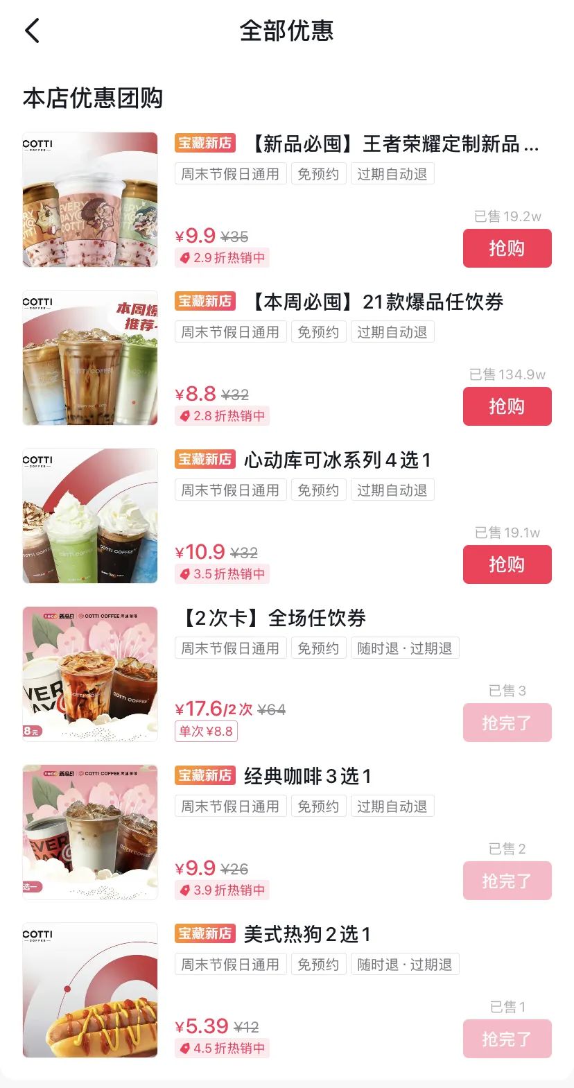 借助去年抖音在本地生活领域的迅速起势,库迪咖啡成为了第一批分享流量红利的品牌,目前其8.8元的爆品任饮券已经在抖音上热卖了130多万单,同时还通过短视频和直播的形式,不断地向消费者传递种草心智。