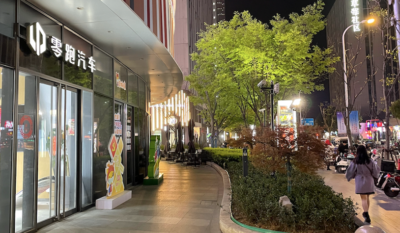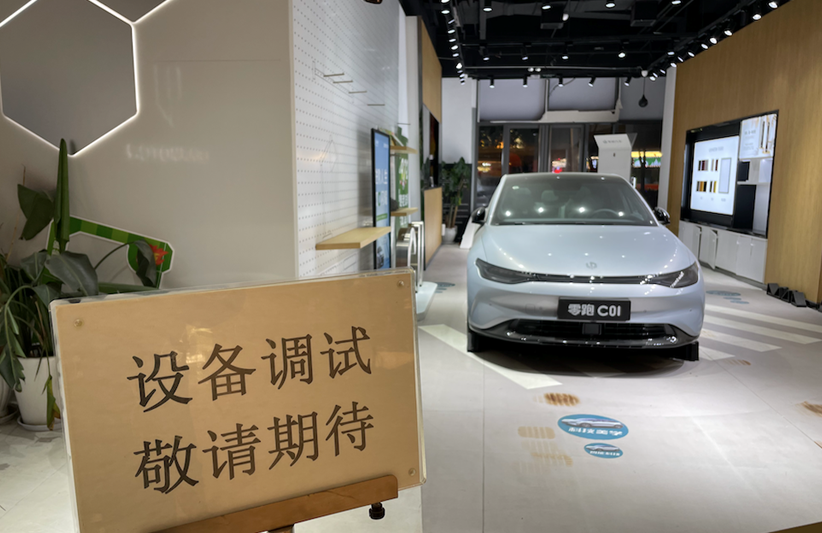这个展厅临街,面积不大,位置不错,既可以通商场内部,也可以通街道。里面摆了一辆零跑C01,车身和地面落满了灰尘,绿植也蔫儿了。