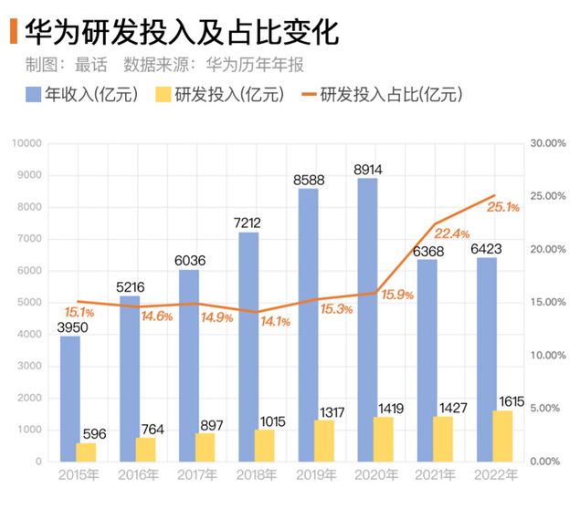 从数据可见,华为的年收入已经从高峰时的8914亿下滑到6423亿,虽然比2021年微增了55亿,但研发投入增加了188亿。