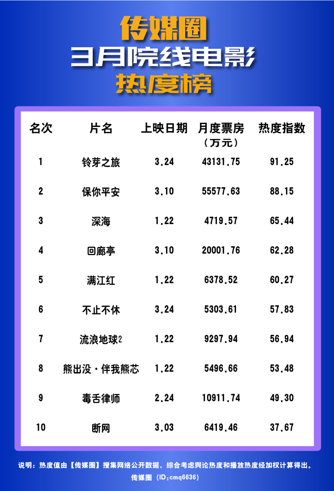 从热度指数来看,《铃芽之旅》作为3月日均票房最高的电影位居第一,长尾效应明显的《保你平安》位列第二。于3月24日登陆视频平台的春节档动画《深海》热度得到二轮浪升,位列榜单第三。